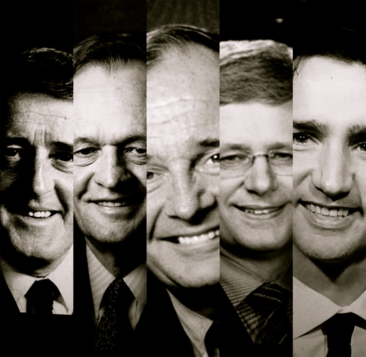 Pictured from left to right are the Canadian Prime Ministers who, since the 1980s, have introduced, influenced, and/or promised changes to a federal science policy: Brian Mulroney, Jean Chrétien, Paul Martin, Stephen Harper, and Justin Trudeau