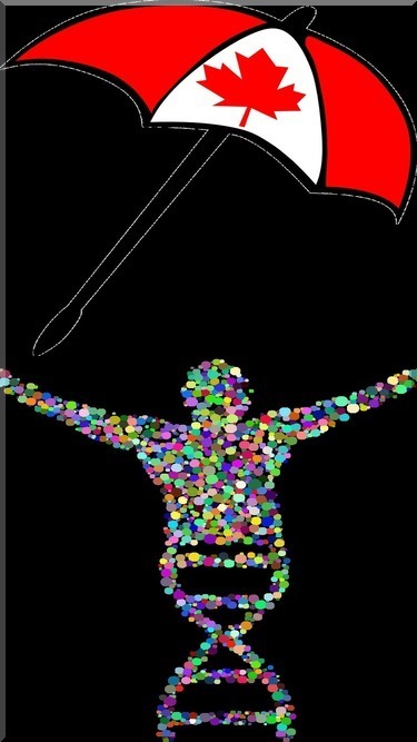 Photo Credit: GDJ and Clker-Free-Vector-Images/pixbay. Image Description: A human-shaped DNA strand covered by an umbrella with Canadian maple leaf symbol.
