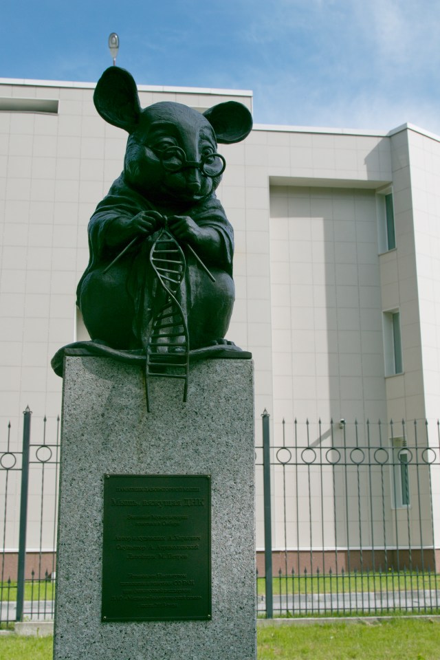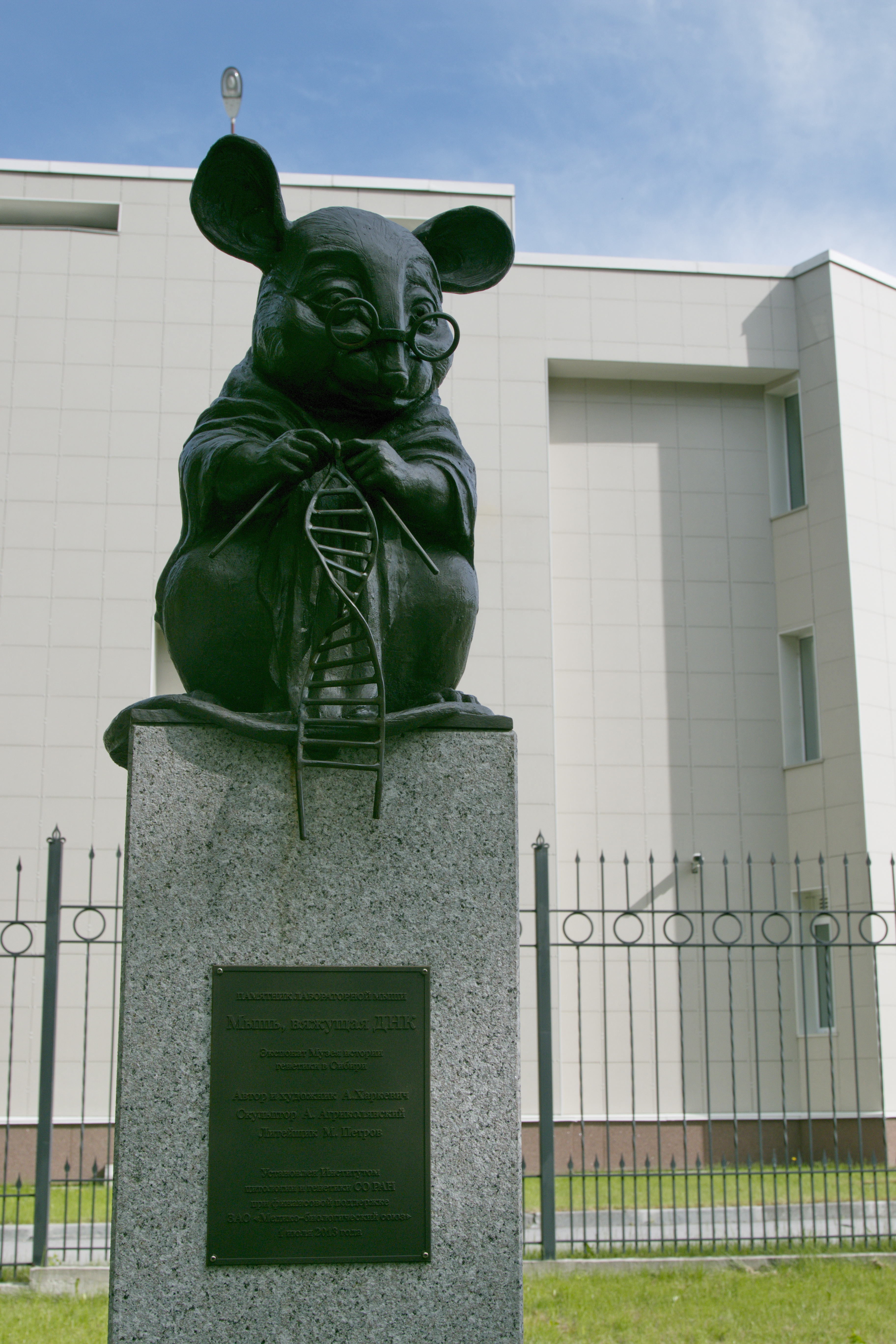 Photo Credit: T/flickr. Image Description: Monument to the laboratory mouse, a mouse knitting a DNA strand behind the Institute of Cytology and Genetics.