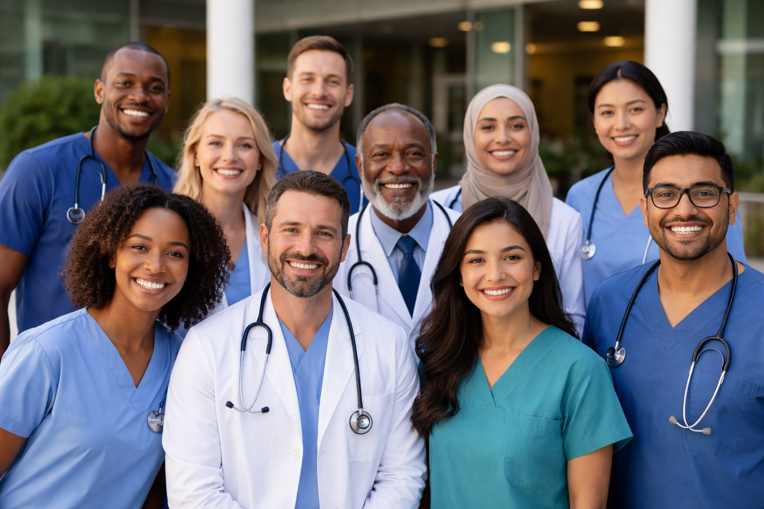 Image Description: An AI generated photo of healthcare workers in scrubs and lab coats representing different races and genders.